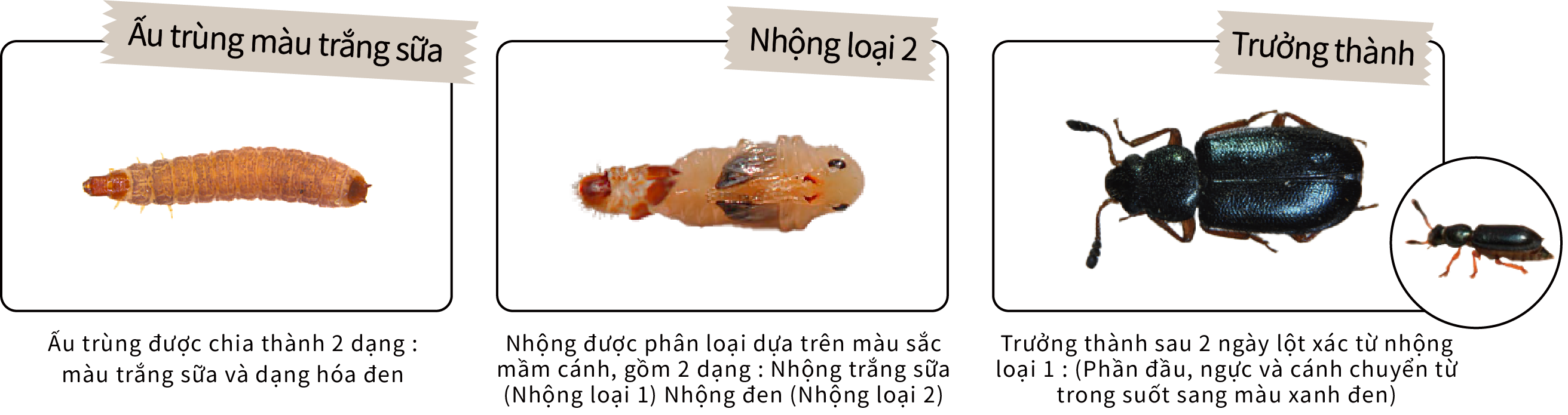 Trong điều kiện nhiệt độ 25-35°C và độ ẩm tương đối 64-70%, thời gian ấp trứng là 4-12 ngày, giai đoạn ấu trùng kéo dài 14-22 ngày. Khi đến giai đoạn trưởng thành, ấu trùng sẽ tạo kén để hóa nhộng. Toàn bộ vòng đời từ trứng đến khi trưởng thành chỉ mất 25-30 ngày, trong khi tuổi thọ của con trưởng thành là 28-63 ngày.