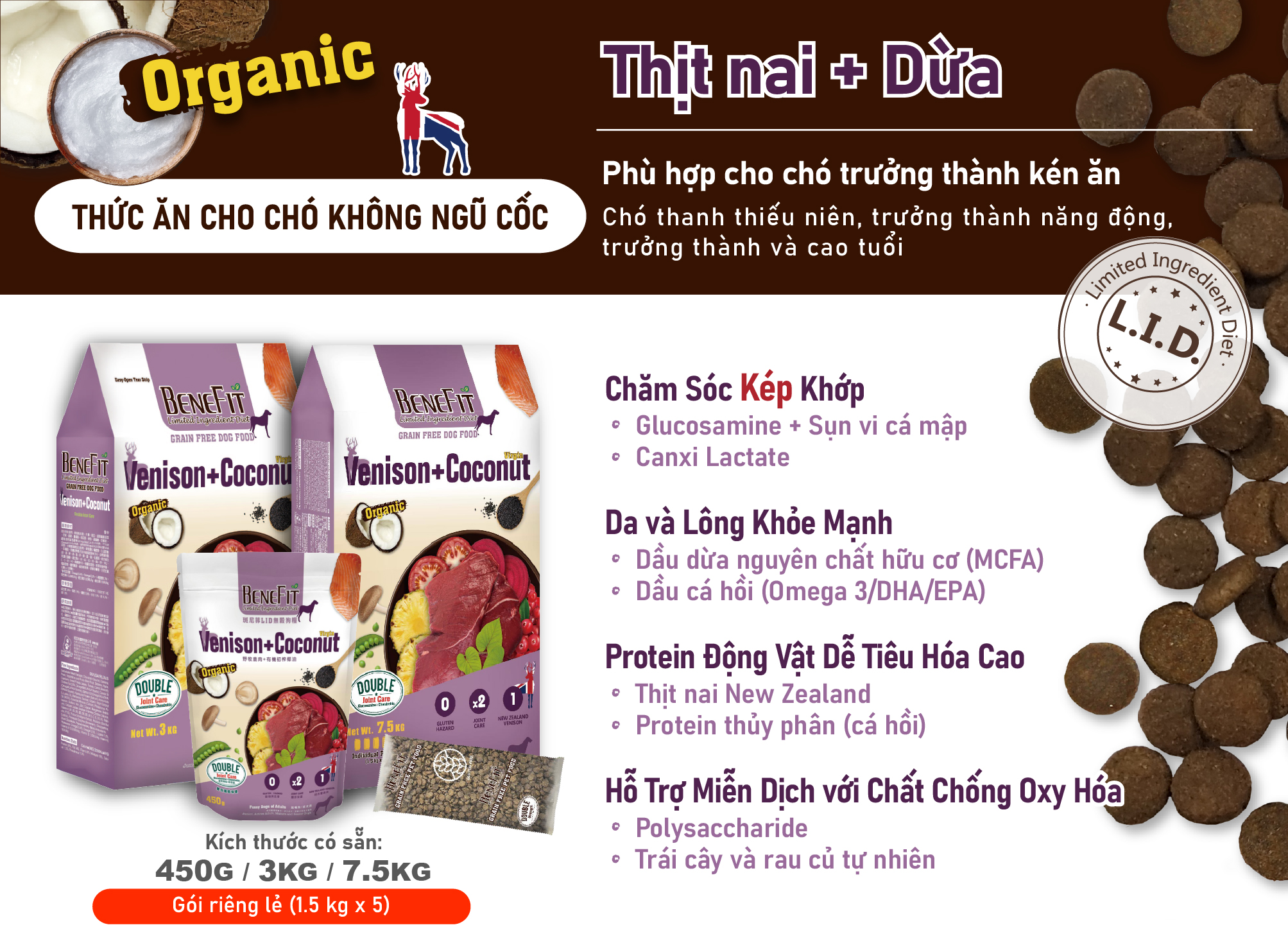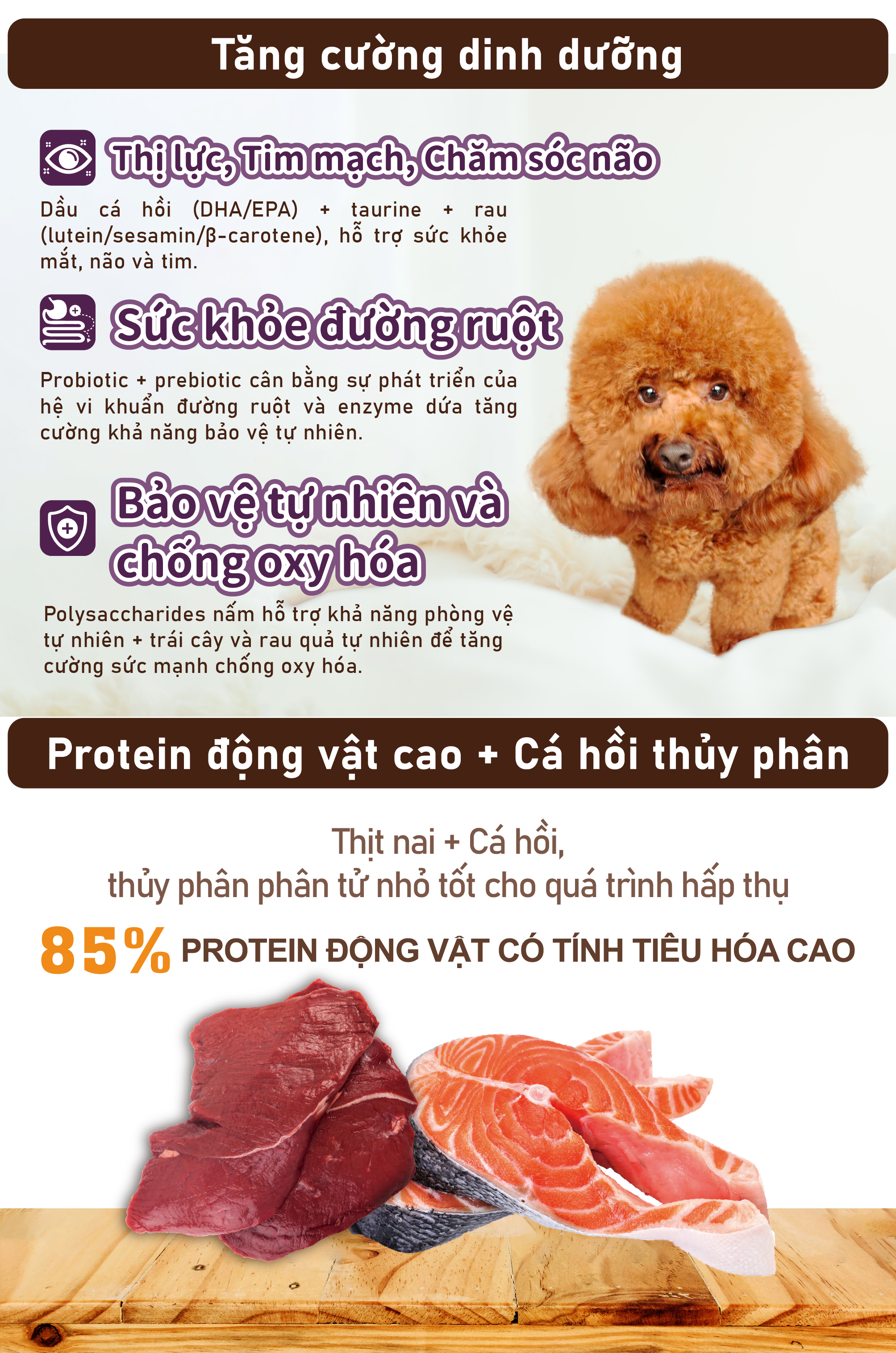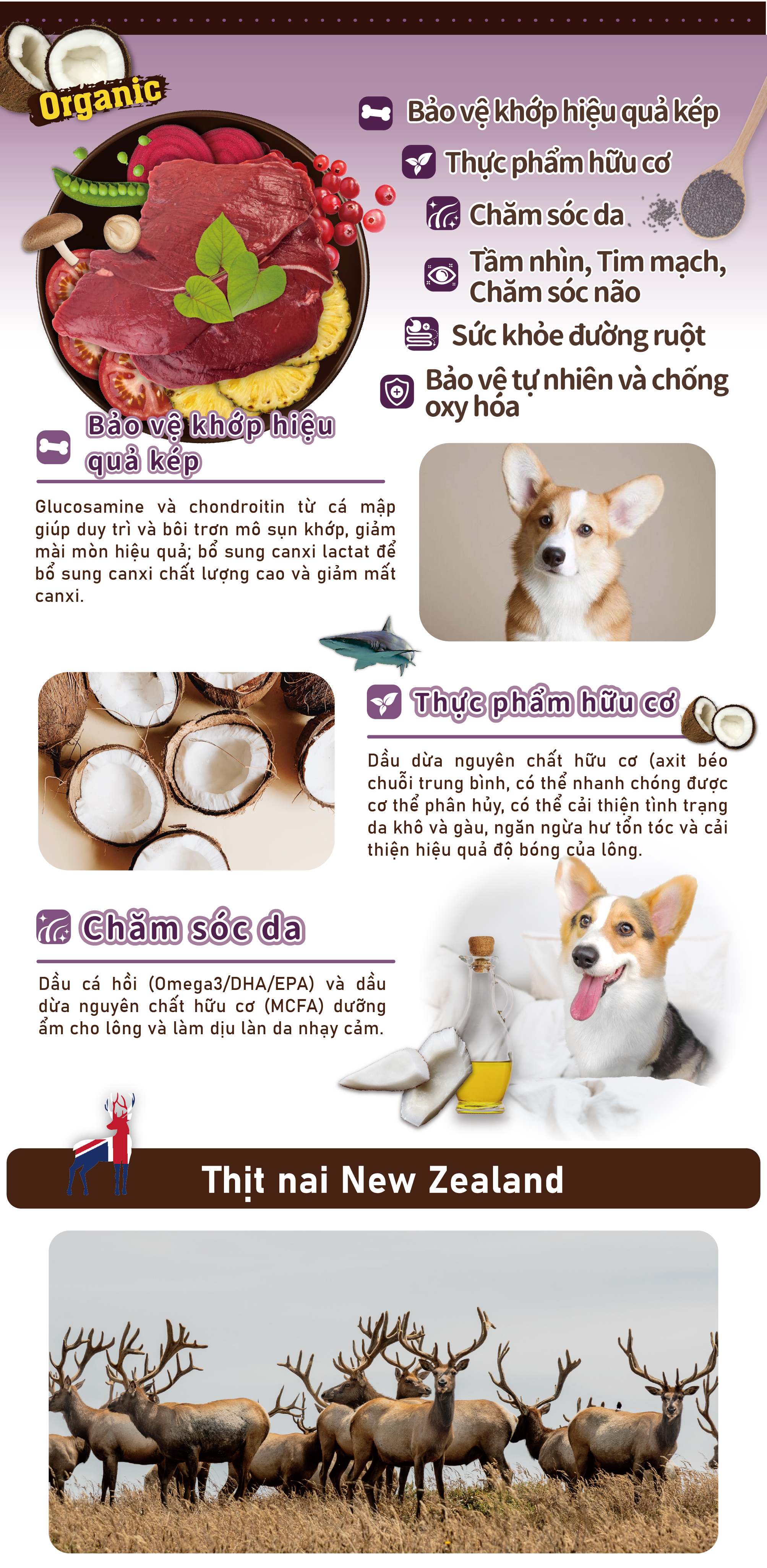Thịt khử nước (thịt nai, nguồn chondroitin), sắn, đậu Hà Lan, rau và trái cây (củ dền, mè, táo, nam việt quất, lá khoai lang, cà chua, cà rốt, bông cải xanh), mỡ gà (nguồn SFA, Omega9&6/LA/ALA), dầu hạt cải (nguồn Omega6/LA/ALA), dầu cá hồi (nguồn Omega3/ALA/DHA/EPA/AA), protein thủy phân (cá hồi), axit amin (L-Lysine, DL Methionine, Taurine), dầu dừa nguyên chất hữu cơ (MCFA), khoáng chất thiết yếu (canxi, phốt pho, kali, natri, sắt, kẽm, đồng, mangan, selen), canxi lactate, đa vitamin (choline chloride, vitamin A, B1, B2, B3, B5, B6, B9, B12, C, E, D3, H), prebiotic (FOS), chiết xuất Yucca Schidigera, probiotic (Bacillus Subtilis), enzyme dứa (Bromelain), glucosamine, chondroitin từ sụn cá mập, polysaccharides, chất chống oxy hóa tự nhiên.