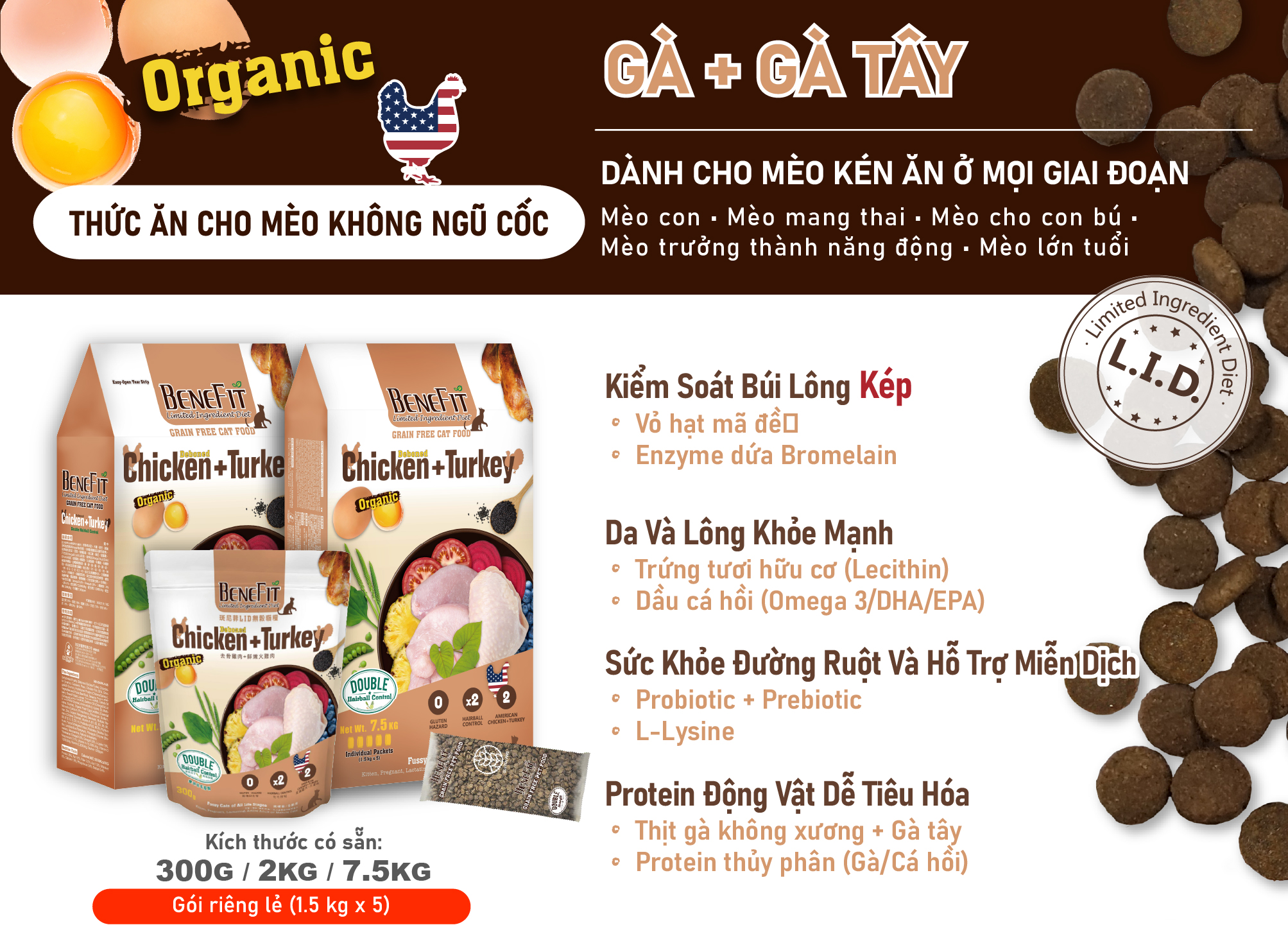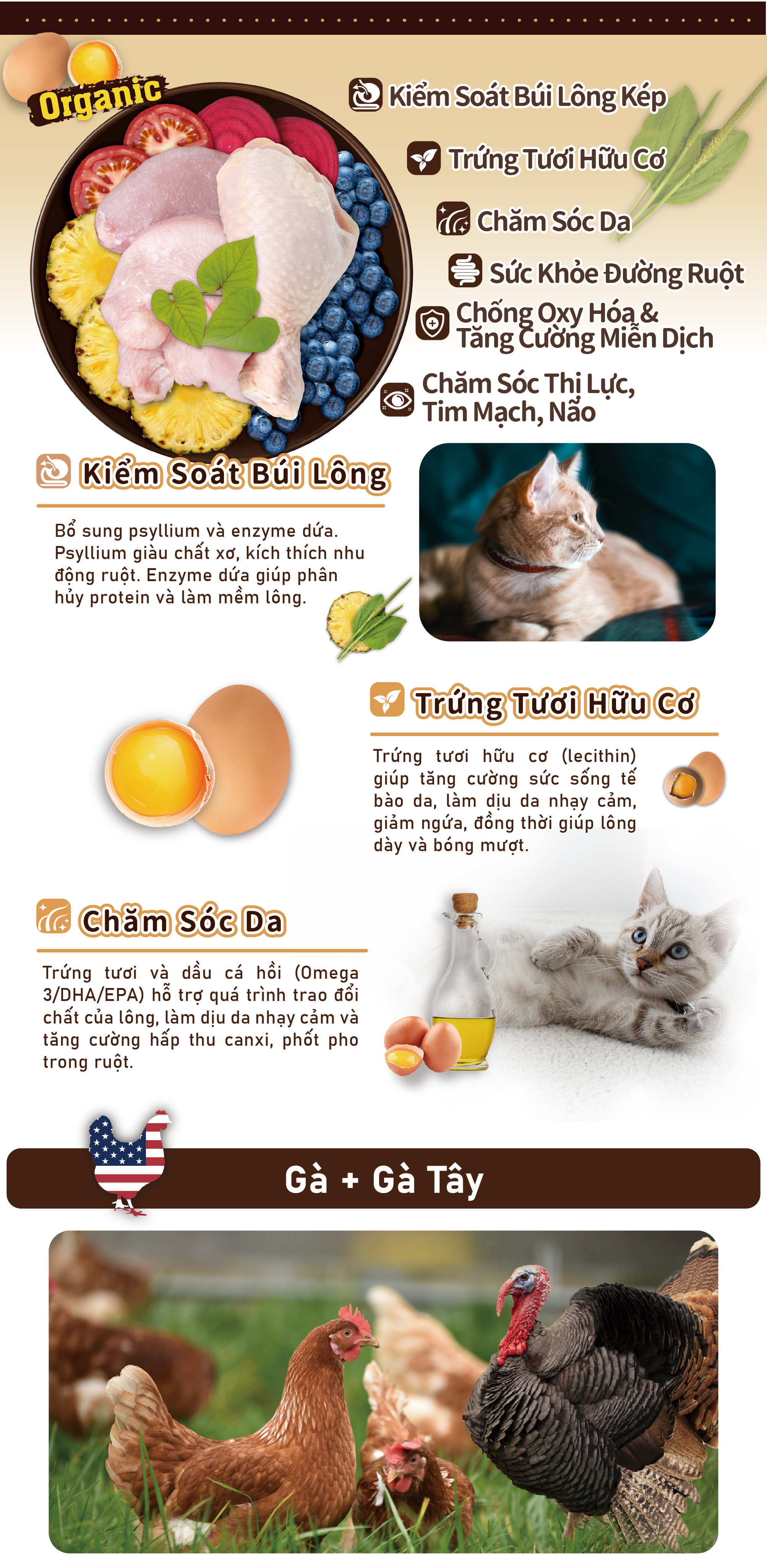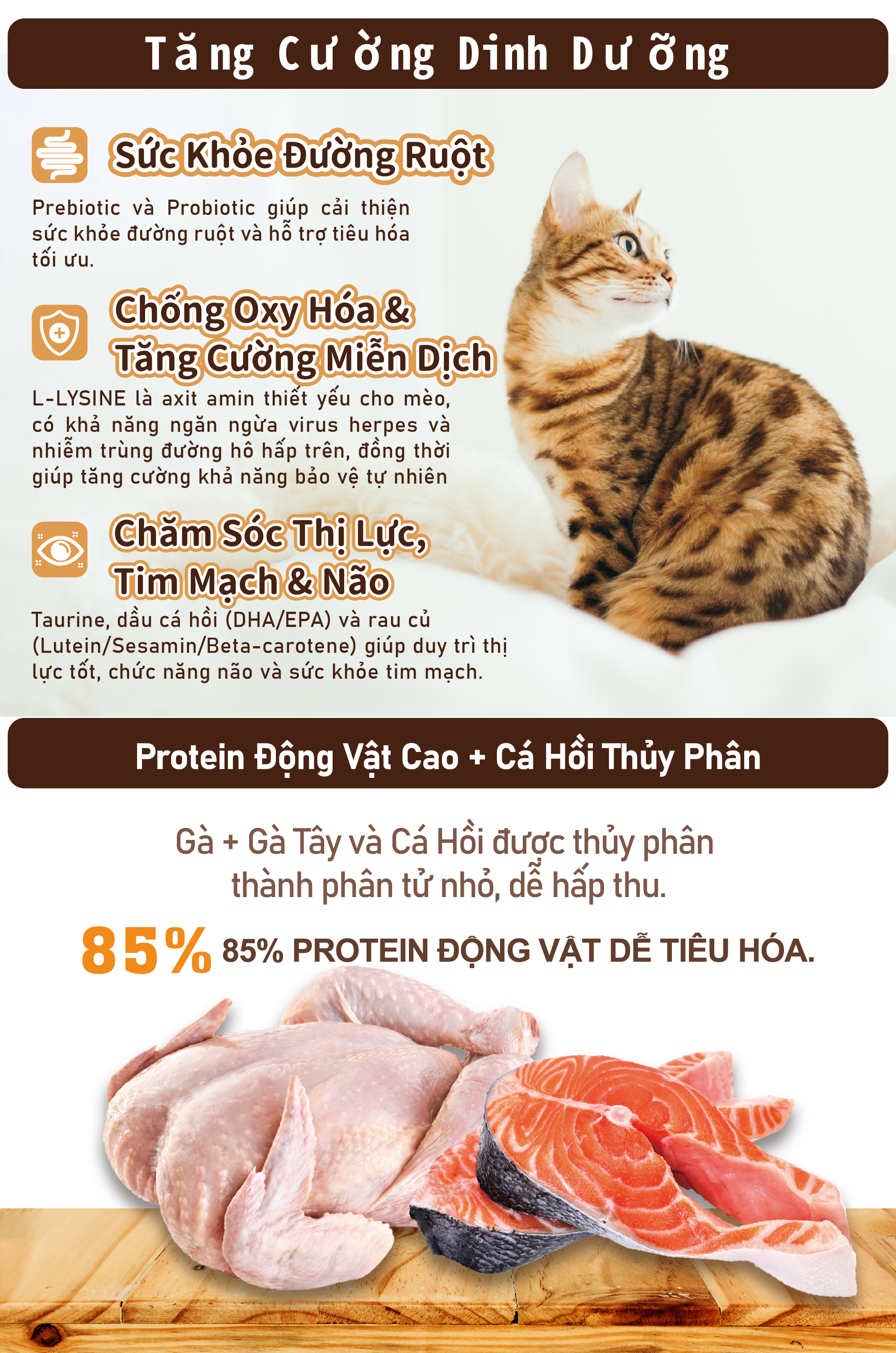 Thịt gia cầm sấy khô (Gà không xương/Gà tây, nguồn Chondroitin), Sắn, Đậu Hà Lan, Mỡ gà (SFA, nguồn Omega 9&6), Protein thủy phân (Gà/Cá hồi), Rau củ & Trái cây (Củ dền, Hạt mè, Việt quất hữu cơ, Lá khoai lang, Cà chua, Cà rốt), Dầu hạt cải (nguồn Omega 6/LA/ALA), Dầu cá hồi (nguồn Omega 3/ALA/DHA/EPA/AA), Axit amin (L-Lysine, DL Methionine, Taurine), Trứng tươi hữu cơ (Lecithin), Khoáng chất thiết yếu (Canxi, Photpho, Kali, Natri, Sắt, Kẽm, Đồng, Mangan, Selen), Vitamin tổng hợp (Choline chloride, Vitamin A, B1, B2, B3, B5, B6, B9, B12, C, E, D3, H), Prebiotic (FOS, MOS), Vỏ hạt mã đề, Chiết xuất Yucca Schidigera, Probiotic (Bacillus Subtilis, Lactobacillus Plantarum), Enzyme dứa (Bromelain), Glucosamine, Chất chống oxy hóa tự nhiên.